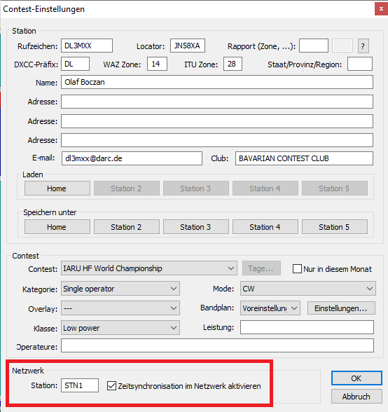 2. Stelle den richtigen Contest ein und aktiviere das Kästchen "Zeitsynchronisation im Netzwerk aktivieren"